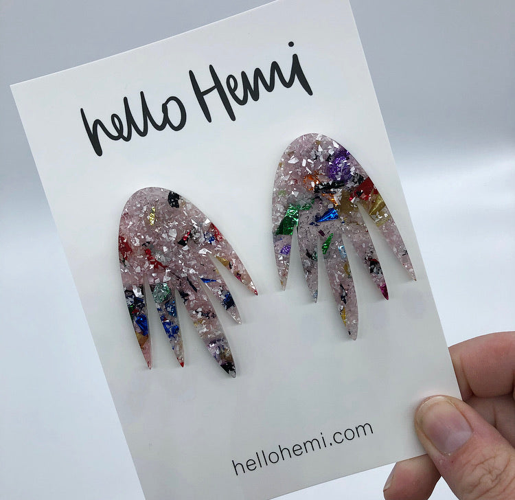 The acrylic used to make these earrings, is made up of foil pieces mixed with clear acrylic. Meaning no two pieces are the same. Chunky glitter density will vary from piece to piece, which means some small areas may be clear. This is not a flaw, just the nature of the material, resulting in a unique piece of jewellery.